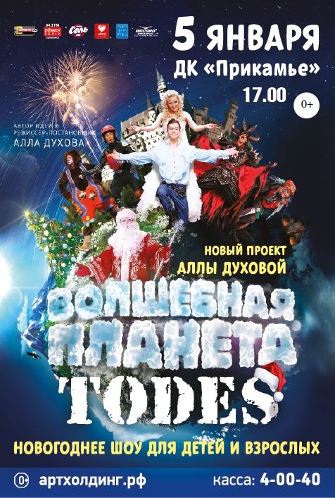 Спешите увидеть! Впервые в Соликамске! Спектакль-сказка "Волшебная планета TODES" - яркое событие в жизни каждого ребёнка. Это невероятно красивая танцевальная история, которая переносит в реальность наши самые любимые сказки! Принцы и принцессы, милые зверушки, невиданные чудеса и волшебники - все эти персонажи не заставят сомневаться в своей подлинности.